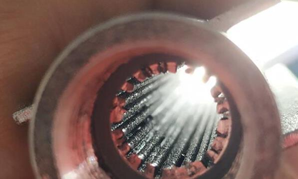 小零件內(nèi)孔去除交叉孔毛刺并不容易,它的孔路有點(diǎn)特殊,首先在底部有個(gè)最大的孔,側(cè)壁上有3個(gè)小孔,然后頂端有個(gè)最小的0.3mm的孔。使用流體拋光機(jī)去毛刺的時(shí)候,很容易在頂端那個(gè)小孔那里出現(xiàn)問(wèn)題。
